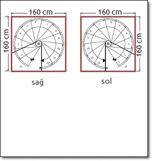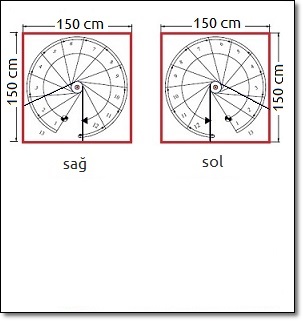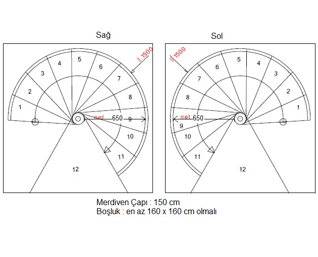 150 cm. çapında olan bu merdiven için tavanda açılacak boşluk; en az 160cm x 160cm kare olmalı.