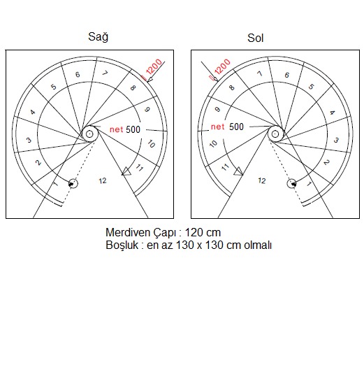120 cm. çapında olan bu merdiven için tavanda açılacak boşluk; en az 130cm x 130cm kare olmalı.