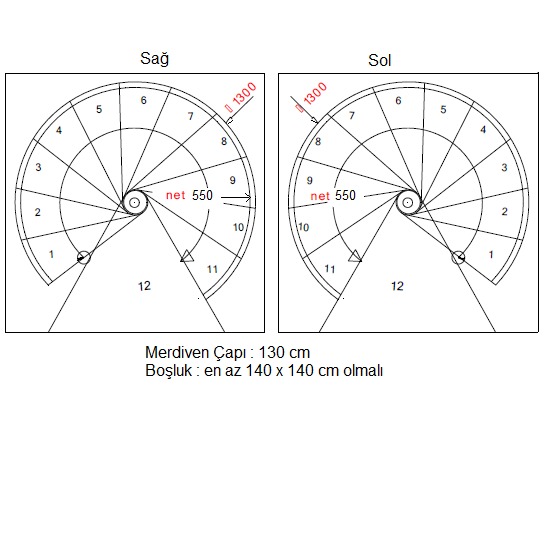 130 cm. çapında olan bu merdiven için tavanda açılacak boşluk; en az 140cm x 140cm kare olmalı.