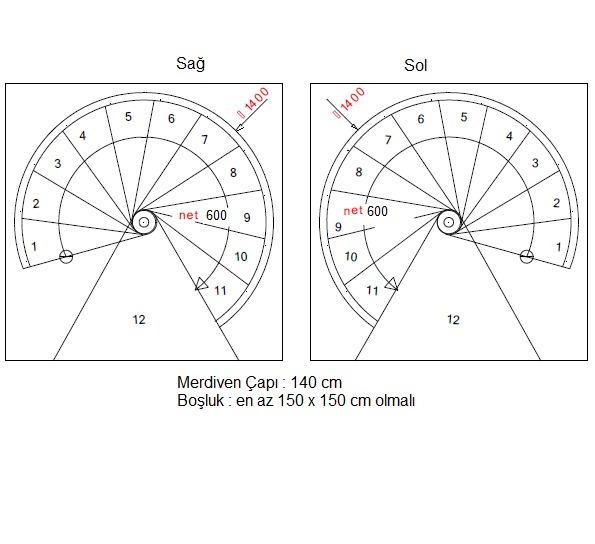 140 cm. çapında olan bu merdiven için tavanda açılacak boşluk; en az 150cm x 150cm kare olmalı.