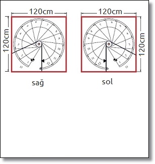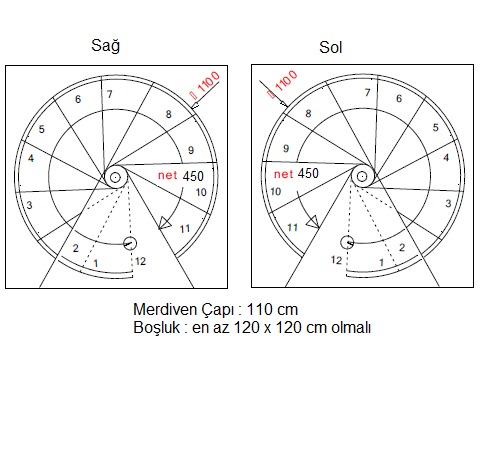 120 cm. çapında olan bu merdiven için tavanda açılacak boşluk; en az 130cm x 130cm kare olmalı.