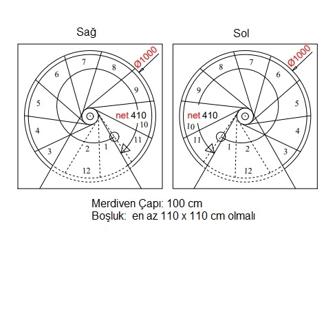 100 cm. çapında olan bu merdiven için tavanda açılacak boşluk; en az 110cm x 110cm olmalı.